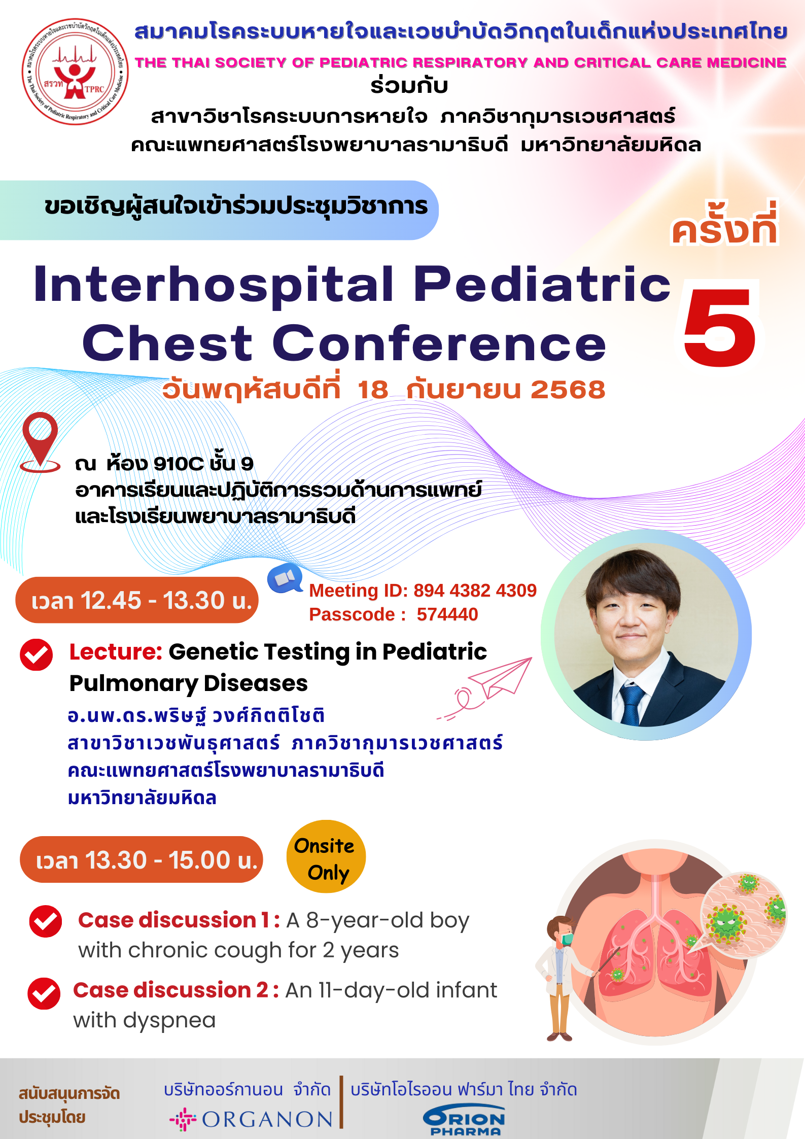 ขอเชิญผู้สนใจเข้าร่วมประชุมวิชาการ Interhospital Pediatric Chest Conference วันพฤหัสบดีที่ 18 กันยายน 2568