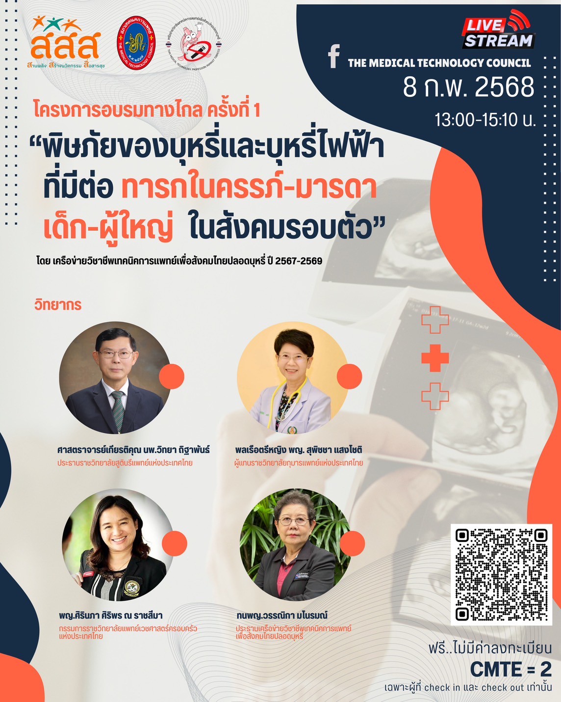 เครือข่ายวิชาชีพเทคนิคการแพทย์เพื่อสังคมไทยปลอดบุหรี่ โดยร่วมให้ความรู้ เรื่อง พิษภัยของบุหรี่และบุหรี่ไฟฟ้าที่มีต่อทารกในครรภ์-มารดา-เด็ก-ผู้ใหญ่ ในสังคมรอบตัว (8 กุมภาพันธ์ 2568)