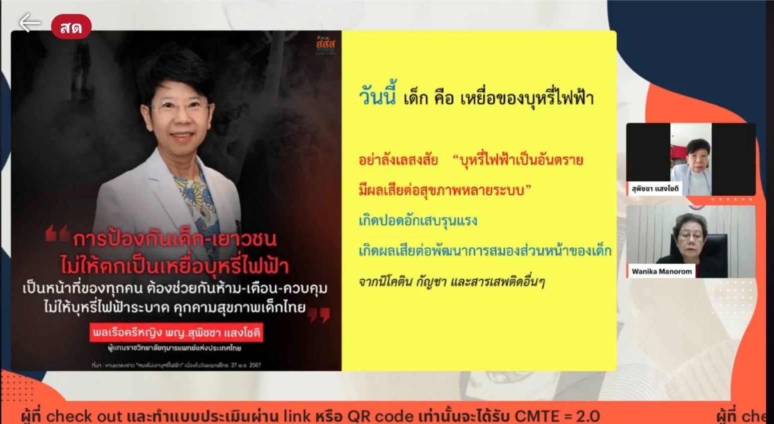 ราชวิทยาลัยกุมารแพทย์แห่งประเทศไทย (รวกท.) ร่วมกับสมาคมโรคระบบหายใจและเวชบำบัดวิกฤตในเด็กแห่งประเทศไทย (สรวท.) โดย พลเรือตรีหญิง แพทย์หญิง สุพิชชา แสงโชติ ผู้นำการสนับสนุนกิจกรรม ได้ประกาศผลการเข้าร่วมการขับเคลื่อนกิจกรรมเพื่อสังคม "ต้านภัยบุหรี่ไฟฟ้าในเด็ก" ในปี 2568 โดยเน้นการสร้างต้นแบบแกนนำกลุ่มให้มีพลังและความตระหนักรู้ถึงพิษภัยบุหรี่ไฟฟ้าต่อเยาวชนอย่างต่อเนื่อง และขยายเครือข่ายความร่วมมือไปยังวิชาชีพและระดับครอบครัว ชุมชน กิจกรรมสำคัญทั้ง 3 โครงการที่เกิดขึ้น (กุมภาพันธ์ถึงสิงหาคม 2568) มีดังนี้