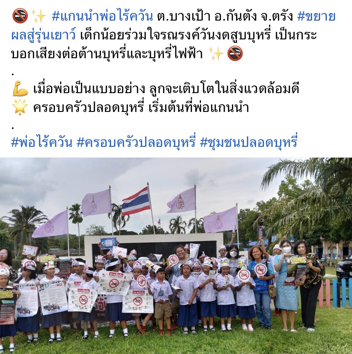 และสำนักงานกองทุนสนับสนุนการสร้างเสริมสุขภาพ (สสส.) ซึ่งมีเป้าหมายหลักเพื่อพัฒนาพ่อแกนนำ ให้เป็นแบบอย่างที่ดีในครอบครัว ชุมชนเพื่อนำไปสู่การป้องกันนักสูบหน้าใหม่