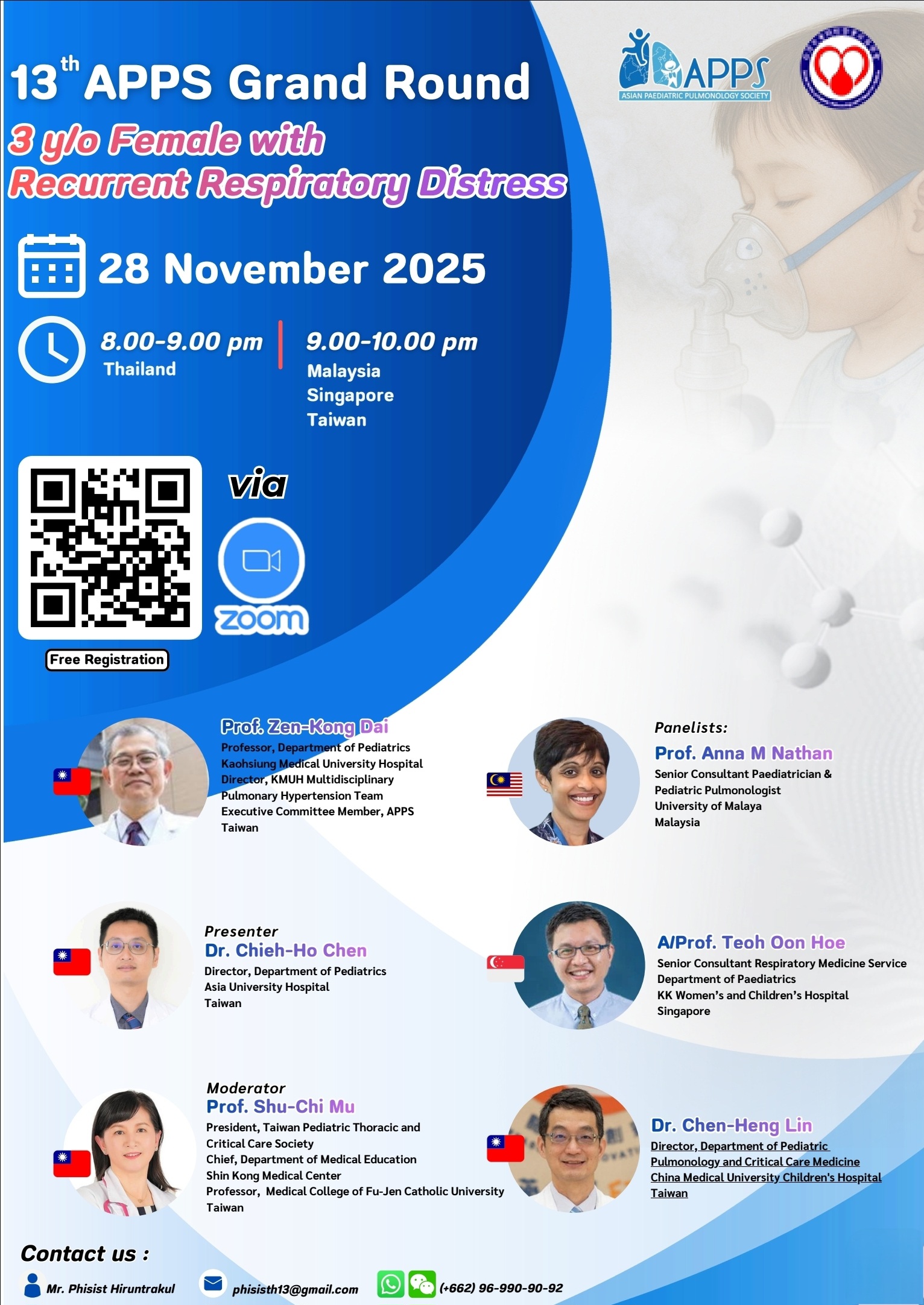 สมาคมโรคระบบหายใจและเวชบำบัดวิกฤตในเด็กแห่งประเทศไทย ร่วมกับ Asian Paediatric Pulmonology Society ขอเชิญผู้สนใจร่วมรับฟังการประชุมออนไลน์ผ่านทาง Zoom