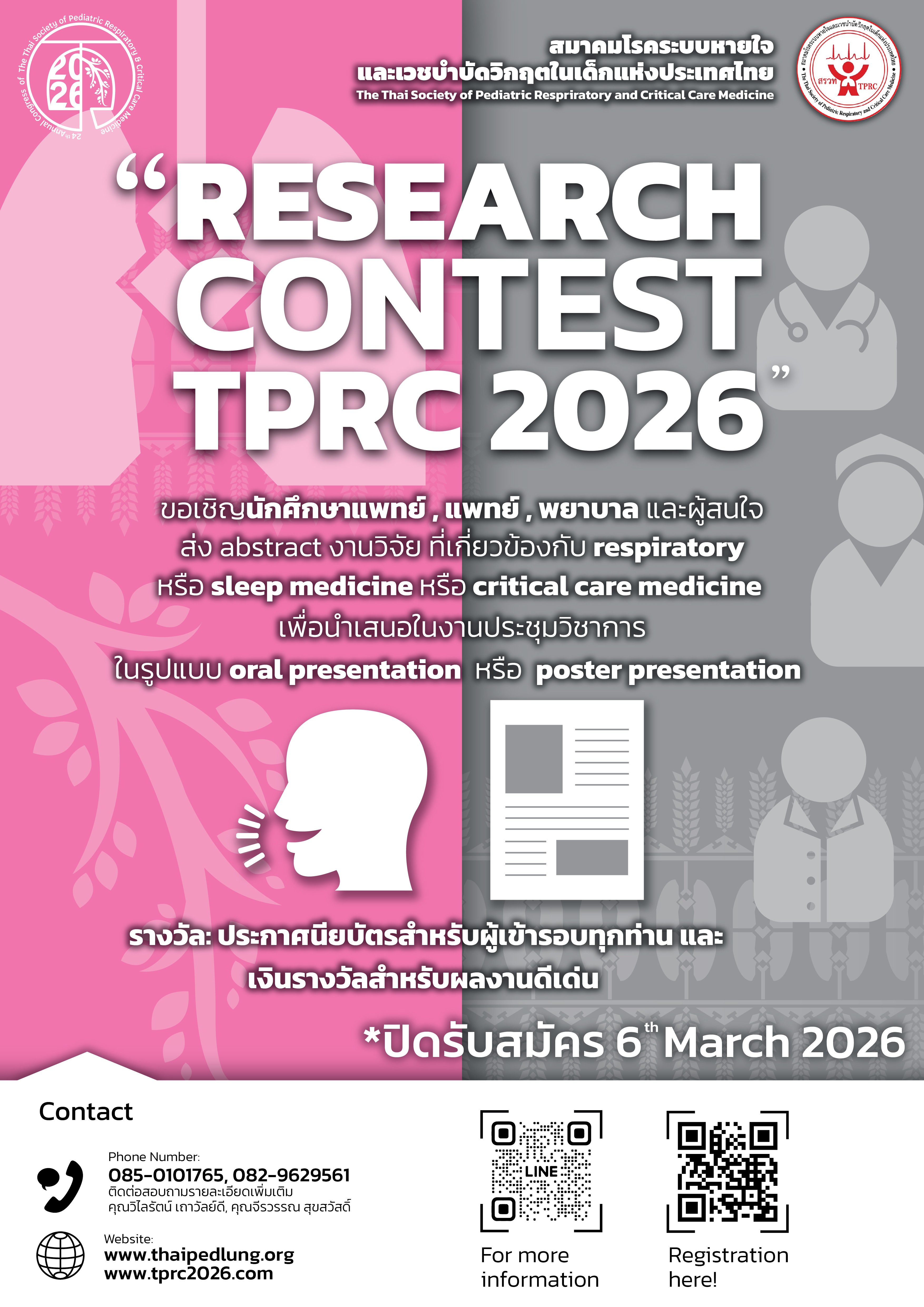 สมาคมโรคระบบหายใจและเวชบำบัดวิกฤตในเด็กแห่งประเทศไทย ขอเชิญชวนแพทย์ พยาบาล นักศึกษาแพทย์ และบุคลากรทางการแพทย์ที่สนใจ ส่งผลงานวิจัยเข้าร่วมประกวดในงานประชุมวิชาการประจำปี TPRC 2026