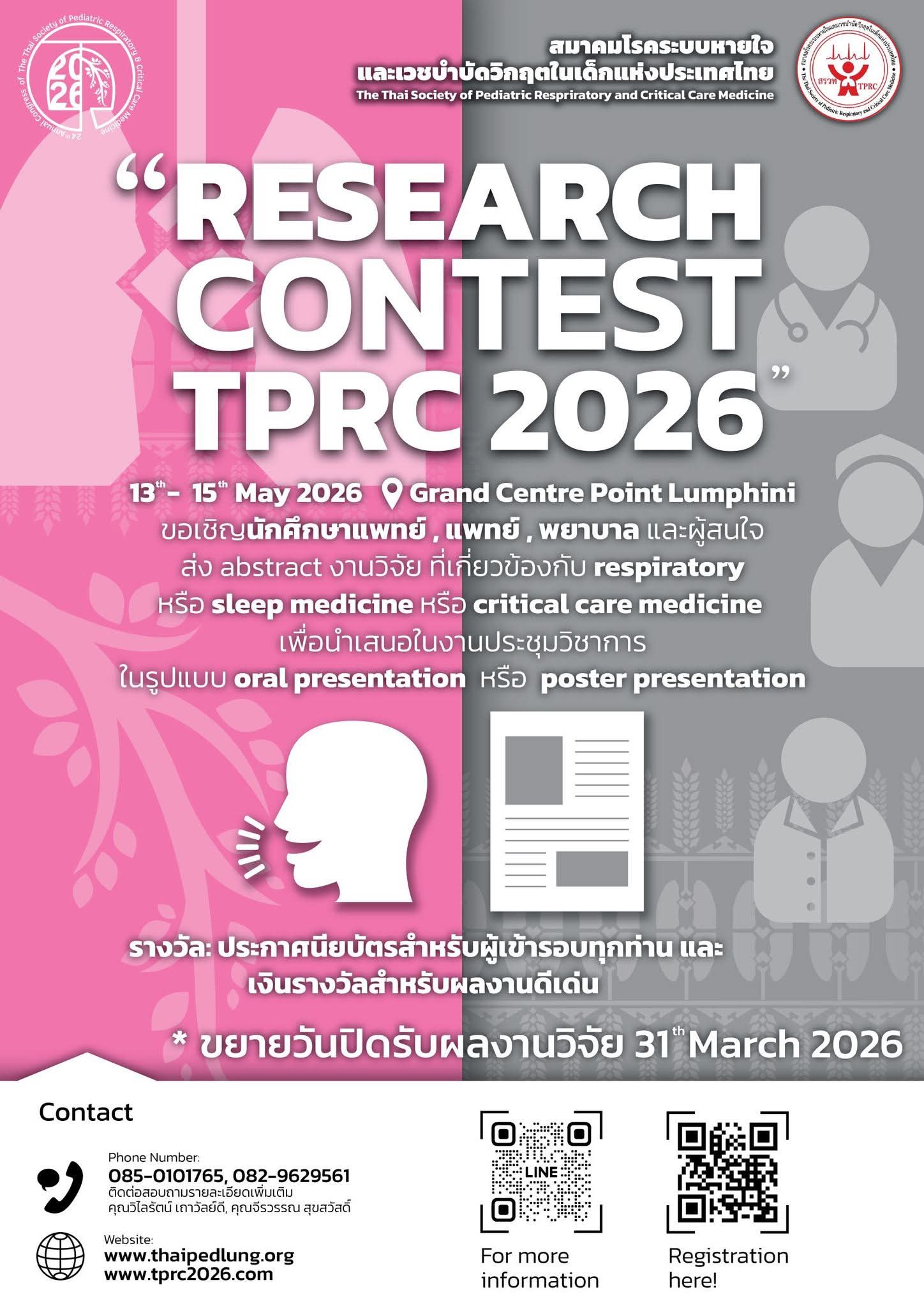 สมาคมโรคระบบหายใจและเวชบำบัดวิกฤตในเด็กแห่งประเทศไทย ขอเชิญชวนแพทย์ พยาบาล นักศึกษาแพทย์ และบุคลากรทางการแพทย์ที่สนใจ ส่งผลงานวิจัยเข้าร่วมประกวดในงานประชุมวิชาการประจำปี TPRC 2026